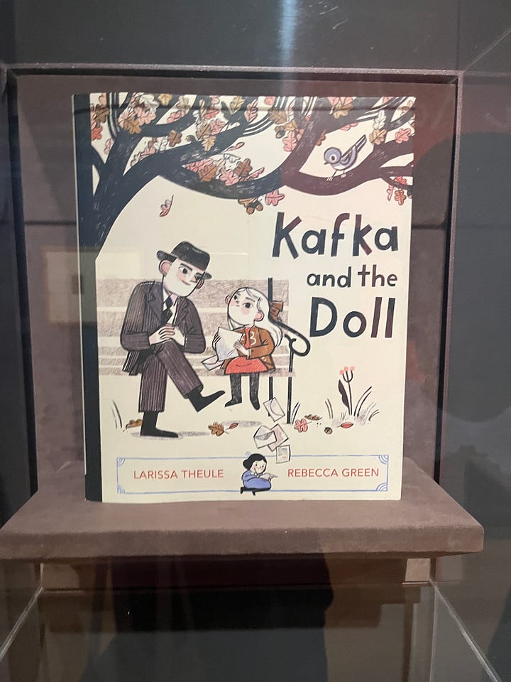 The exhibit undermines the image of the slightly-built author as a lonely figure estranged from an off-putting society. Among the items shown are a children’s book riffing on an encounter between Kafka and a little girl who lost her doll in a park; Kafka then sent letters to the girl in the voice of the doll recounting its voyages. There is also a photograph of Kafka, flanked by shepherd canine and a Prague barmaid. A version of the photo was published on the cover of a book “Lonely, like Franz Kafka,” cropping out the woman and the dog. “The image of Kafka as ‘an unhappy single man’ persists to this day,” reads a caption in the show.