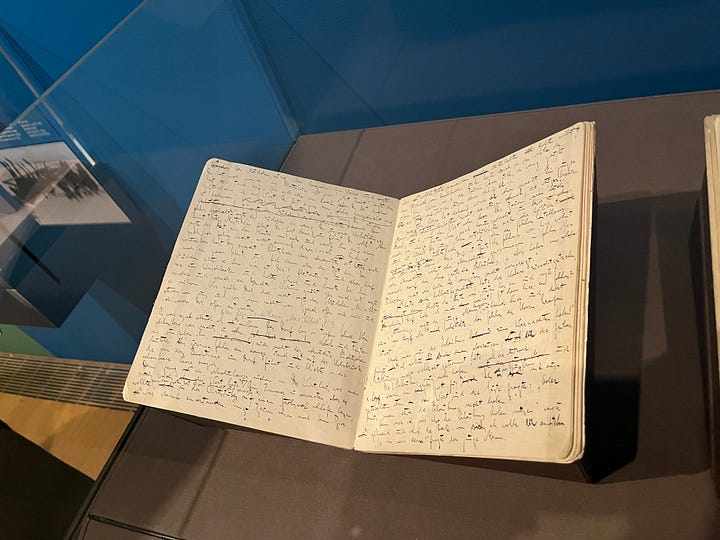 We see postcards in which Kafka playfully bantered with his favorite sister Ottla, recounting satisfying trips to Italy and France; other items give a window into Kafka’s personal quirks: his meticulous approach to exercising, his vegetarianism, highly unusual in his lifetime, and his disdain for noise, a kryptonite to the creative reflection that fueled his fiction. We also learn about Kafka’s curiosity about his Jewish identity as he examined what it meant to him.
